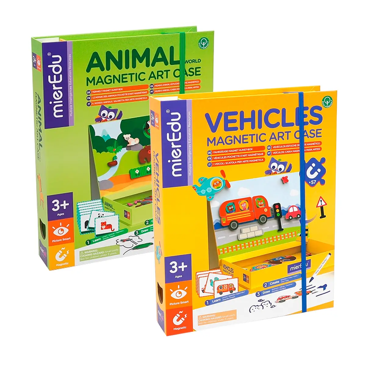 Giv børn sjov læring og kreativ leg med denne sampak af mierEdu magnetbøger med temaerne biler og animal world. Med disse magnetiske aktivitetsbøger kan børn skabe deres egne scener og historier, mens de udvikler finmotorik og fantasi.
