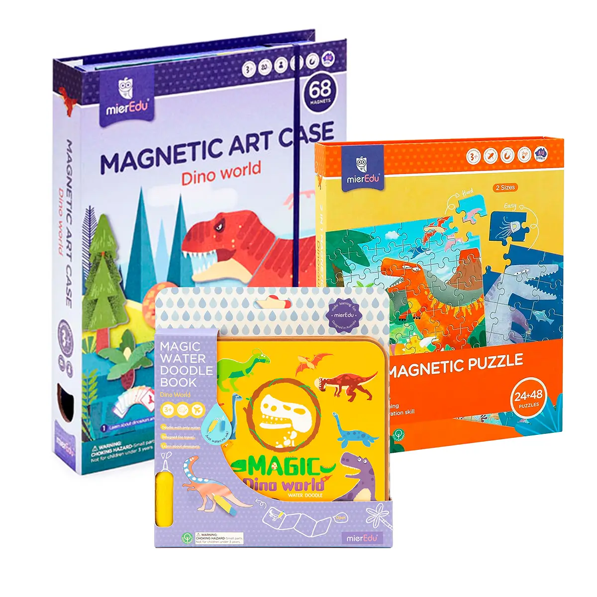 Med denne spændende mierEdu sampak kan børn dykke ned i dinosaurernes verden gennem leg og læring. Sættet indeholder et magnet-puslespil, en vandmalebog og en magnetisk krea-boks/magnetbog, der tilsammen giver børn sjove og lærerige aktiviteter, samtidig med at deres nysgerrighed om fortidens kæmper stimuleres.