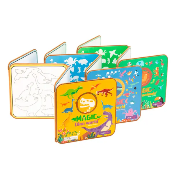 - Indeholder: 3 vandmalebøger (Forrest Animals, Sea World og Dino World)